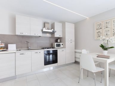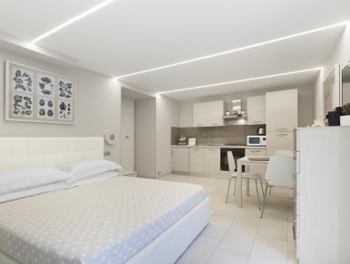 Il nostro monolocale può ospitare due persone e dispone di una cucina completamente attrezzata (piano cottura, forno, frigorifero, forno a microonde e lavatrice), un letto matrimoniale affiancato da un comodo armadio e una cassettiera, bagno privato con doccia in vetro ed un balcone privato con vista sul giardino del cortile. L’intero appartamento è dotato di un impianto stereo con filo-diffusione ed un impianto di riscaldamento/ aria condizionata gestibile in maniera autonoma.